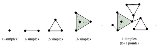 A topological space can be understand as a set of points sampled from some with neighbors. The neighbor relations could be used to study the connectivities in a graph. In algebraic topology, the basic building blocks is simplicial complex, which is a data structure that explains how to ‘glue’ a topological space with simplices, i.e., points, edges, triangles, tetrahedra, and even their higher-dimensional generalizations. The definition of simplex is Definition 1 and the illustration can be found in Figure 2. Generally, a k-dimensional simplex is defined by k + 1 vertices.