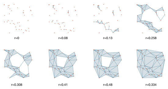 For the building process of Rips complex, here we use a similar illustration as in [36]. We consider the distance for vertices x and y. For the simplicial complex theory we consider a ϵ-ball with the radius for the vertices set namely the original data point cloud. Intuitively, if we increase the radius ϵ gradually, when the distance between any two vertices is less than ϵ the edge appears. Then it is easy to think that for three vertices, the ϵ-balls intersect mutually (not totally merge together), a triangle appears; while for three vertices a tetrahedron emerges, and higher dimensional simplices whenever possible. We consider the process in Figure 3, the original point cloud is vertices without any edges with ϵ = 0. When ϵ = 0.08, any vertices with distance less than 0.08 are connected, thus some edges appear. Keeping on increasing ϵ, finally, any two points are linked, thus generating a fully connected graph (r = 0.334), and triangles are generated as well. At each stage, the homology of the simplicial complex is changing, some components born while some died. For instance in Figure 3, the quadrilateral hole is born during an event time before e = 0.41 and dies at the event time after e = 0.48. Then we can say the hole is alive between ϵ = 0.41 and ϵ = 0.48. Similarly, there are much more higher-dimensional holes when we consider a more complicated point cloud in practical applications.