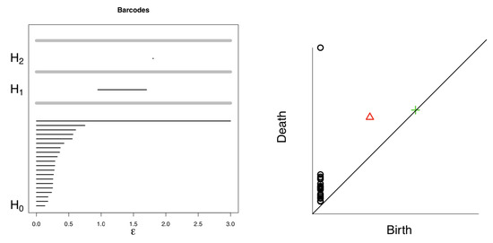 So far the gait dynamics time series are converted into data point clouds, each with a series of Rips complex namely graph filtration. The filtration topological characteristics are changing while the ϵ changing, the process could be visualized using the barcodes. The topological feature is a bar plot which starts and ends when a topological property appears and disappears. For example in Figure 3, the sole hole in when ϵ = 0.41 appears and disappears at when ϵ = 0.48, the barcode for this hole is born at ϵ = 0.41 and dies at ϵ = 0.48. With all such “holes” and the corresponding born time and death time, the topological features are represented. Then each topological feature of the point cloud has a birth time and death time . The features set with birth and death times is . This set can be illustrated in the Barcode plot and persistence diagram as in Figure 4.