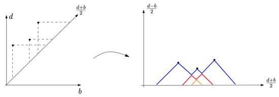 An example of transformation from a persistence diagram to the persistence landscapes [43]. Left: the horizontal axis in the persistence diagram is the birth time, while death time is on the vertical axis. Right: the horizontal axis is the average of the homologies’ birth death event times, and vertical axis for .