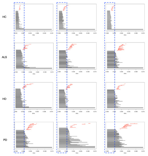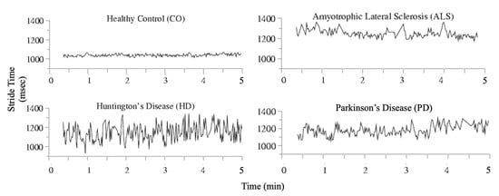 The raw data of the database were obtained using force-sensitive resistors, with the output roughly proportional to the force under the foot. The stride-to-stride measurements of footfall contact times has been derived from the signals, which includes left stride interval, right stride interval, left swing interval, right swing interval, left stance interval, right stance interval, and double support interval. As well the left/right swing interval percentages of stride, left/right stance interval percentages of stride, and double support interval percentages of stride are extracted. The detailed description and experiment settings of the dataset can be referred to [11,45]. Illustrations for each group in the dataset are shown in Figure 6.