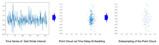 The time series are time-ordered observation sequences from the corresponding underlying dynamical systems. Time-series analysis problems can thus be transformed into the studies of dynamics behind the observed time-ordered data [27]. The phase-space reconstruction method is such a kind of tool developed for dynamics analysis towards time series analysis. Even though the reconstructed space by phase-space reconstruction is not identical to the real system, the abstract spaces reveal the system properties because of the topological equivalent [28]. Typical applications for biomedical signal analysis are [29] for multiple heartbeats ECG analysis, and [30] for streaming time series analysis with the application to motion analysis. In this work, we first convert the gait time series into gait data point cloud as the phase space reconstruction, using time-delay embedding.