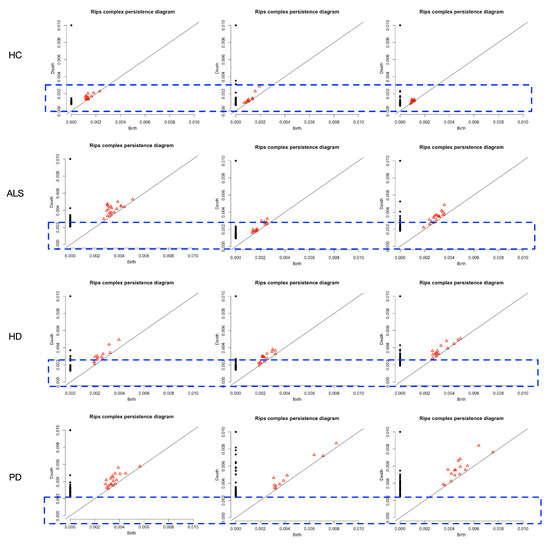 In this study, we further processed the barcode information to derive the persistence landscape as the features to be used in the classification task. We adopted Wasserstein distance for the gait dynamics application. Mathematically, the persistence diagram encoded from the k-dimensional homology α information in all scales. As the last section described, the homology α was “born” at and “dies” at , which makes a pair and pair set . We use to denote each pair and consider such pair as a point. Then the barcode graph can be transformed into a persistence diagram graph with birth indices on horizontal axis and death indices on the vertical axis as in Figure 4.