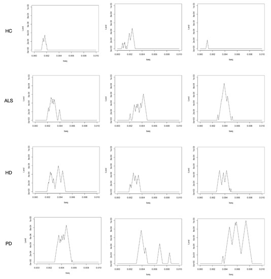 After the replacement of time intervals, we use the right-foot stride-interval signals from the HC, ALS, HD, and PD groups in the experiments. In this work, we consider the classification performances in a one-vs-one setting as in former studies like [10,46]. The involve classification groups are the HC, ALS, HD and PD groups, we consider the binary classification performance of HC group versus ALS group, HC group versus HD group, and HC group versus PD group.