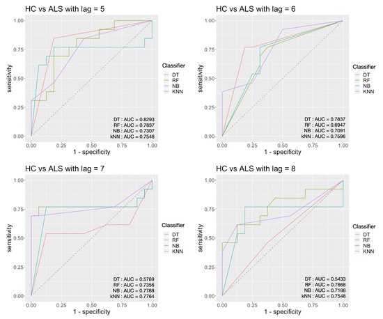 The empirical mode decomposition (EMD) method was proposed in [8], five types of time series of gait rhythm fluctuations were involved: stride time, swing time, stance time, percentage swing time, and percentage stance time. The best AUC score achieved with the EMD technique was 0.934 with the multi-layer Perceptron classifier in the HC vs. ALS classification. The phase synchronization and conditional entropy (PSCE)-based method was proposed in [54], with the same data source as in EMD methods in [8], the best AUC score was 0.824 with a multi-layer Perceptron classifier in the HC vs. ALS classification. Determine learning strategy using left and right swing intervals, and the left and right stance intervals was proposed in [55], with an accuracy of 89.66% in the HC vs. ALS classification.