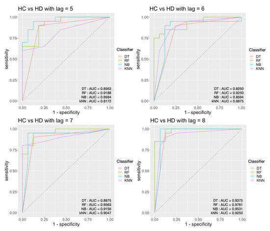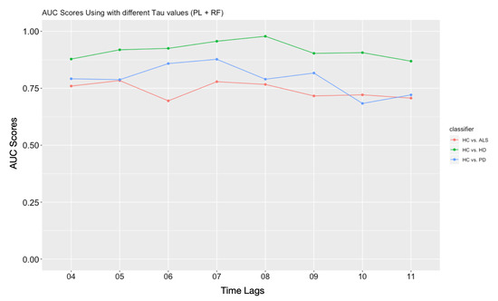 The topological features are based on the data point cloud generated by the reconstruction of the state space. Better reconstruction of the phase state space from the time series could better reflect the real pattern of the dynamical system. There are lots of principles has been proposed to solve this problem, such as the average mutual information, to determine an appropriate dimension and time lag parameter. However, since our main purpose is to get better performances for the wholistic system, an optimal parameter for a specific time series is different from the classification task here. In our work, we only consider a 2-D situation, so the time lag parameter for embedding has a great impact on TDA feature generation. So we adopt a heuristic strategy to search for the range of time lag within the range from 4 to 11 since the reconstruction lag should be neither too large nor too small. This process is illustrated in Figure 14, and we consider the wholistic classification performances with an AUC score.