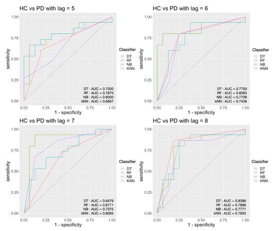 We use the methodology proposed in Section 2 to build the topological feature sets for each subjects. The right-foot-stride time series for each sample are transformed into persistence landscapes. Then three binary classification tasks are performed using a leave-one-out cross-validation (LOO-CV) strategy [47] to evaluate the models using the classifiers. Then we have 16 persistence landscape feature vectors for HC group, 13 for ALS, 20 for HD, and 15 for PD. For each classification task, we have data samples from the HC group and its corresponding abnormal group. First, we leave one sample out from the classification data set, and use the remaining samples to train the classifier. Second, the trained classifier was used to predict the label of the sample that was left out. Third, the process was performed with different leave-out choices of samples in the data set.