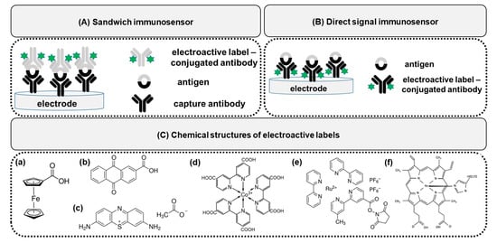 In this review, we are going to concentrate on the antibody-electroactive probe conjugates and their use in sandwich and direct signal immunosensors. A sandwich-type-format immunosensor consists of an unlabelled primary capture antibody and an electrochemically-detectable, redox-active label-conjugated signalling secondary antibody (Figure 1A). Upon binding of a specific antigen and the next signalling antibody, an increase in the redox-active molecule current is detected. In the case of a direct signal immunosensor, the antibodies labelled with redox-active tags act as a capture and signalling antibody simultaneously, and the direct electron transfer of the label is detected (Figure 1B). Upon formation of immunocomplexes, the redox active label current decreases due to the increasing spatial blocking.