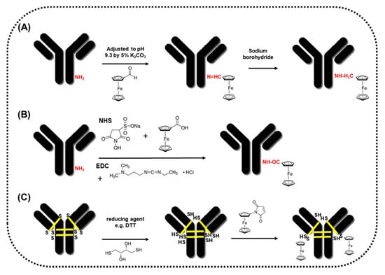 The method of antibody modification with ferrocene using mixed anhydride activation of ferrocenecarboxylic acid was presented by Kossek and co-workers in 1996 [33]. The activation of ferrocenecarboxylic acid was done by addition of tributylamine and later isobutyl chloroformate. The coupling of activated ferrocene with the antibody took 2 h at room temperature. The final product was dialyzed against phosphate buffer. The same activation method has been used for antibody (Ab) conjugation with ferrocene (Fc) with various ratios of both components Ab:Fc [34]. The authors confirmed the redox activity of various antibody-ferrocene conjugates using cyclic voltammetry (CV) studies with a carbon paste microelectrode. They observed increased ferrocene electroactivity with the increasing of its moiety in the cases of conjugates with a molar ratio of Ab:Fc: 1:3.8, 1:4.6, 1:19.3, 1:35.4 and 1:125.8, respectively. Whereas, immunoreactivity between the antigen (here digoxin) and its antibody did not change for all conjugates up to a 1:35 molar ratio of Ab:Fc and dropped by 50% for conjugates with a molar ratio of 1:125.8. In the procedure described by Lim and Matsunaga [35], the mixture of ferrocenemonocarboxylic acid, EDC (1-ethyl-3-(dimethylaminopropyl) carbodiimide hydrochloride and IgG was incubated for 4 h at room temperature. Atomic absorption spectroscopy experiments showed that 11 iron atoms from ferrocene were conjugated to IgG, whereas cyclic voltammetry experiments proved the electrochemical properties of ferrocene conjugated with IgG at the graphite electrode. The oxidation of ferrocene in Fc-IgG immunocomplex has been observed at a potential of 395 mV versus Ag/AgCl. Similarly, as in the previous papers, authors have observed the oxidative current increasing with relation to an increasing number of ferrocene molecules on the IgG antibody. A comparison of two methods of antibody conjugation has been published by Okochi and others [36]. The first procedure presented in Figure 2A involves modification of IgG with ferrocenecarboaldehyde (Fc-CHO) via formation of a Schiff base and its reduction using sodium borohydride. The second protocol (Figure 2B) was based on a conventional method using activation of the –COOH group from ferrocenemonocarboxylic acid (Fc-COOH) using EDC, followed by addition of NHS (N-hydroxysuccinimide) in order to increase efficiency and creation of dry-stable intermediates. The authors showed that there is a three-fold improvement in the efficiency of the first procedure based on Fc-CHO as compared to the second procedure based on Fc-COOH. Authors have estimated eight ferrocene moieties labelled to IgG using the Fc-CHO method and atomic absorption spectroscopy experiments. Electrochemical signals for IgG labelled with Fc-CHO increased by 14-fold as compared to IgG labelled with Fc-COOH, as observed at the potential of 390 mV vs. Ag/AgCl. Thus, it has been proved that the number of redox-active moieties on IgG influences sensitive detection of particular antibodies. Despite those results, the preparation of antibodies labelled with Fc-COOH has been frequently reported in many papers [37,38].