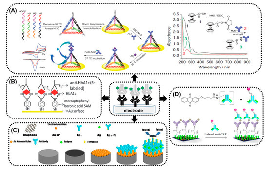 Selected examples of sandwich immunosensors based on electroactive label conjugates. (A) Schematic illustration of Au electrode modification using the DNA nano-pyramids (DPs) and ferrocene-labelled anti-IgG and Uv-vis spectra of ferrocenecarboxylic acid and anti-IgG, FeC-anti-IgG (reprinted with permission from Yuan et al. [43]). (B) Scheme of gold screen-printed sensor modification using mercaptophenyl boronic acid self-assembled monolayers and ferrocene-tagged anti-glycated haemoglobin antibodies (reprinted with permission from Chopra et al. [44]). (C) Scheme of the fabrication of the sandwich immunosensor based on graphene/gold nanoparticle composite and ferrocene-labelled secondary antibodies (reprinted with permission from Wang et al. [45]). (D) Schematic illustration of screen-printed graphene electrode modification using anthraquinone-labelled, C-reactive, protein-specific antibodies (reprinted with permission from Jampasa et al. [46].