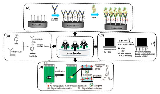 In example work presented by Prabhulkar and others [50], the reagentless and mediatorless strategy for the detection of cancer biomarker vascular endothelial factor (VEGF) has been described. The disc-shaped carbon fibre microelectrodes were fabricated and modified with ferrocene monocarboxylic acid labelled anti-VEGF antibodies using bifunctional polyetheramine cross-linker Jeffamine®ED-600 (Figure 4A). Such a procedure allowed for reagentless electrochemically-enhanced detection based on direct oxidation of the ferrocene label. The formation of immunocomplex between the ferrocene-labelled anti-VEGF antibody and the VEGF caused a decrease of the ferrocene oxidation peak current, registered at 0.52 V using linear sweep voltammetry in 0.5 M NaClO4 solution. The resultant drop in the oxidation current was further employed to quantify the amount of VEGF. The detection mechanism is connected with the increased spatial blocking caused by formation of bulky immunocomplexes, further hindering the electron transfer of the ferrocene molecules to the carbon fibre electrode surface. The presented detection strategy offers acceptable reproducibility indicated by a max value of the RDS of 8.9% for the intra-assay and 11.2% for the inter-assay.