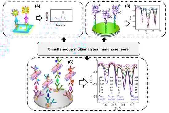 Schematic illustrations of immunosensors based on a multi-electroactive probe strategy. (A) simultaneous detection of two analytes using neutral red and thionine labels conjugated to specific antibodies (reprinted with permission from Wu et al. [63]). (B) Simultaneous detection of three analytes using thionine, ferrocenecarboxylic acid, and tris(2,2′-bipyridine-4,4′-dicarboxylic acid)cobalt(III) labels conjugated to specific antibodies (reprinted with permission from Zhu et al. [65]). (C) Simultaneous detection of four biomarkers using anthraquion-one 2-carboxylic acid, thionine, ferrocenecarboxylic acid, and tris(2,2′-bipyridine-4,4′-dicarboxylic acid)cobalt(III) labels conjugated to specific antibodies (reprinted with permission from Zhu et al. [67]).