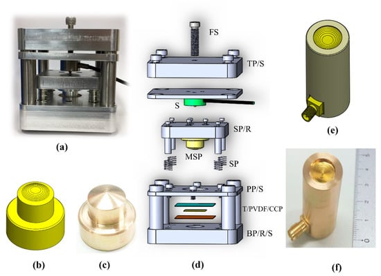 (a) A photograph of the press-fit structure; (b) the designed multi-spherical pattern (MSP); (c) a photograph of the MSP; (d) the press-fit’s components: base plate/rod/screw (BP/R/S), Teflon/PVDF/copper-clad polyimide (T/PVDF/CCP), pressure plate/screw (PP/S), spring (SP), MSP, slide plate/rod (SP/R), sensor of force (S), top plate/screw (TP/S), and force screw (FS); (e) the profile of MFP transducer; and (f) a photograph of the MFP transducer.