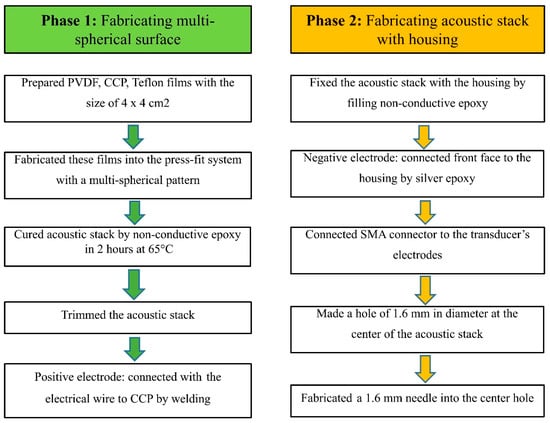 In the second phase, the acoustic stack was fabricated to a transducer housing. The acoustic stack was concentrically attached to the transducer housing. An open space was filled with a nonconductive epoxy inside the housing to keep the transducer’s long-term electrical and mechanical stability. Following the epoxy curing, the transducer housing was connected to the connector. A piece of silver epoxy (H20 epoxy, Epoxy Technology, Inc., USA) was cast between a piece of PVDF and the housing to create a ground path. A drill was used to form a hole of 1.6 mm at the center of the transducer’s surface, and a 14G needle (Syringe needle, Anhui, China) was then inserted into the hole with a thin layer of UV adhesive (Norland products, Inc, Cranbury, NJ, USA) to maintain the spherical form of the PVDF film. The laser cable was inserted inside the needle and adjusted at the transducer’s focal point to obtain the best resolution PA image.
