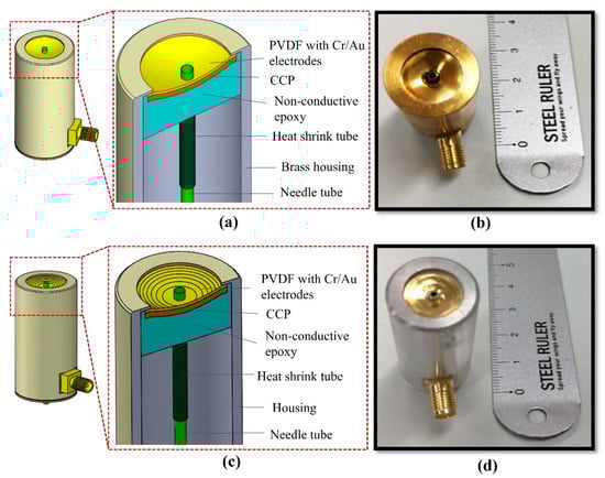For the SFP transducer, a steel ball bearing (Hecto, Jiangsu, China) of 25.4 mm in diameter was used to form a single spherical surface, producing a focal point at 12.7 mm and one focal zone of 0.48 mm. The same 28 µm PVDF film was used to fabricate an SFP transducer with an aperture diameter of 12 mm. Figure 5 shows the transducers’ cross-sectional view and photographs of the ring-shaped transducers.