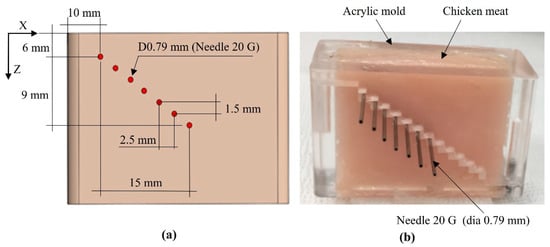 Figure 7 shows the structure (Figure 7a) and photograph of a chicken-needle (CN) phantom. The chicken meat was placed into an acrylic mold, and 20G (syringe needle, Anhui, China) stainless steel needles (outer diameter, 0.79 mm) were inserted at different depths of the acrylic mold (Figure 7b). The needle phantom was composed of seven needles, which were separated by 1.5 mm in the Z-axis and 2.5 mm in the X-axis. The top surface of the chicken meat sample was flattened in the same plane as that of the top plane of the acrylic mold.