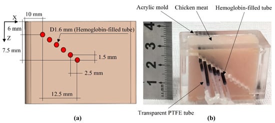 Figure 8 shows the structure (Figure 8a) and photograph of a chicken-hemoglobin (CHb) phantom, in which transparent polytetrafluoroethylene (PTFE) tubes (Zeus, Orangeburg, USA) containing Hb (Sigma-Aldrich, Merck, Seoul, South Korea) were embedded. The hemoglobin concentration of 13.6 g/dL is suitable for optical absorption coefficient of 4.0 cm−1 at 800 nm. The blood hemoglobin (Hb) concentration test is one of the most commonly performed tests; the normal Hb level in the human body ranges from 12 to 16 g/dL [21]. Hb is the iron-containing metalloprotein involved in the transport of oxygen that is found in nearly all vertebrates’ red blood cells, as well as in some invertebrates’ tissue. Hb in the blood transports oxygen to the whole body from the lungs or gills. Hb samples were injected into transparent tubes with a 1.6 mm outer diameter and 25 mm length. Hb-filled tubes were embedded at different depths of the chicken tissue in the acrylic mold (Figure 8b). To produce imaging targets at different depths, the CHb phantom comprised six Hb-filled tubes, which were positioned diagonally by 1.5 mm in the Z-axis and 2.5 mm in the X-axis.