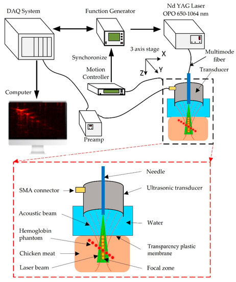 Of late, optical techniques have been used widely in biomedical imaging, which has improved the performance of in vivo diagnosis with high optical contrast [1,2]. This approach produces strong light scattering effects and a low spatial resolution. The optical microscopy penetration depth is limited to approximately 1 mm. Photoacoustic (PA) imaging (PAI) is a biomedical imaging modality based on the PA effect [3,4,5,6,7]. When short-pulsed laser light is directed on tissues, chromophores absorb some of the light energy that is converted into acoustic waves due to rapid thermal expansion. Photoacoustic microscopy (PAM) is also widely used to image tissues through optical absorption [8,9,10,11,12,13]. PAM can image optical contrast beyond the existing depth limit for high-resolution optical imaging [14]. The spatial resolution depends on the performance of the ultrasonic transducer. Many studies developed photoacoustic tomography by employing a short pulse to generate ultrasound waves in biological tissues; such techniques are used for in vivo biomedical imaging [1,15].