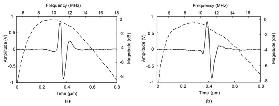 Figure 9 shows a schematic diagram of the experimental process. A computer-controlled remote (DPR 500, JSR Ultrasonics, Pittsford, NY, USA) pulser/receiver and the transducer was connected to excite an electrical impulse at a 200 Hz repetition rate at Ω damping with 3 µJ energy per pulse. To measure the pulse-echo and frequency spectra of the transducer, a glass plate was positioned at the focused position as a target. The reflected signal was received using a 500 MHz bandwidth receiver with a high pass filter of 5 MHz and a low pass filter of 500 MHz. The attained raw data were digitized at a sampling frequency of 500 megasamples/s. An 8-bit digitizer (NI PCI-5153EX, National Instruments, Austin, TX, USA) was used to digitize echoes.