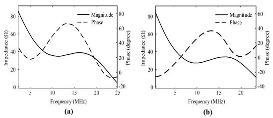 Figure 12 shows the measured electrical impedance (magnitude and phase) of the fabricated SFP and MFP transducers. In the SFP transducer, the electrical impedance was measured at a magnitude of 36 Ω and a phase angle of 46° at 11 MHz. In the MFP transducer, the electrical impedance was measured at a magnitude of 32 Ω and a phase angle of 15° at 11 MHz.