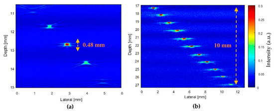 Figure 13 shows B-scan images of the wire phantom attained using the ring-shaped transducers. The wires were positioned in the transducers’ focal zones and produced the bright points in the image; otherwise, they appeared as blurred points in the images. In the ultrasound image of the 11 MHz SFP transducer (Figure 13a), only a single bright point at a depth of 12.7 mm was displayed, because the focal length of the SFP transducer was 12.7 mm. Using the seven-focal-point transducer, the ultrasound image of the wire phantom at 11 MHz was captured, as shown in Figure 13b. We observed that the MFP transducer displayed eleven bright points, showing a large focal zone (10 mm) for deeper images, which is significantly higher than the SFP transducer’s focal zone (0.48 mm).