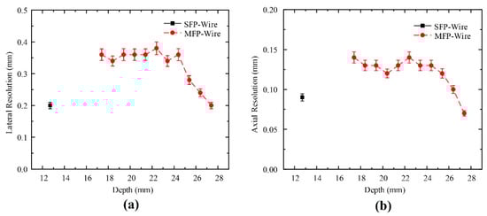 Figure 14 shows the lateral and axial resolutions of the SFP and MFP transducers. Using the wire phantom target, the spatial resolution of transducers was determined at full width at half maximum. At a depth of 12.7 mm, the SFP transducer had lateral and axial resolutions of 200 µm and 90 µm, respectively. In contrast, the MFP transducer can capture wire images at depths from 17.4 mm to 27.4 mm. The measured lateral resolutions at depths from 17.4 mm to 24.4 mm had a similar value of 360 µm. Lateral resolutions decreased linearly to 200 µm at a depth of 27.4 mm (Figure 14a). The measured axial resolution of the MFP transducer had a similar value of 140 µm at depths from 17.4 mm to 25.4 mm (Figure 14b).
