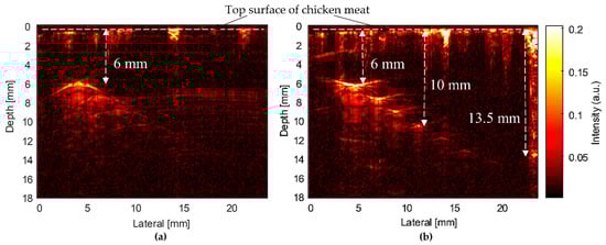 Figure 15 shows the PAM images of the CN phantom obtained using two transducer types. The SFP transducer’s PAM image displayed only one bright point at a depth of 6 mm (Figure 15a). In this case, a penetration depth of 6 mm was measured from the top surface of chicken meat to the image depth, in which the first needle was placed in the chicken tissue. The deeper needles’ images were not displayed clearly. The MFP transducer captured the PAM image of the first four needles at depths from 6 mm to 10 mm (Figure 15b). The brightest point is the first needle’s image at a depth of 6 mm. At a depth of 10 mm, the image of the fourth needle can be seen clearly. The image depth in chicken tissue was measured from the chicken meat’s surface to the farthest image point (0–10 mm). Therefore, the penetration depth of the MFP transducer in this CN phantom was measured to be 10 mm. However, blood vessels in the chicken phantom can absorb laser energy, which generates ultrasound waves and reflected signals to the transducer for forming images. Figure 15b shows the PAM image of the blood vessels at the top surface of the chicken meat, at the depth of 3 mm above the first needle, and at the right side from a depth of 0 to 13.5 mm. In this case, the penetration depth was measured to be 13.5 mm. Therefore, in this phantom, the MFP transducer’s penetration depth for the stainless steel needles is 10 mm and the penetration depth for chicken blood vessels is 13.5 mm.
