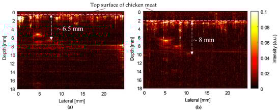 Figure 16 shows the PAM images of the CHb phantom obtained using two fabricated transducers. The SFP transducer’s PAM image displayed only a single bright point at a depth of 5 mm (Figure 16a). Therefore, the penetration depth of the SFP transducer in this phantom was measured to be 5 mm. The MFP transducer’s PAM image displayed three bright points at depths from 6.5 mm to 10 mm (Figure 16b). Therefore, the penetration depth of the MFP transducer in the CHb phantom is 8 mm, which was measured from the chicken meat’s surface to the third image point.