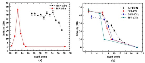 For biomedical imaging applications, the PAM images of the CN phantoms in Figure 15 were obtained by two types of transducers. For the SFP transducer, the measured penetration depth and intensity were 6 mm (Figure 15a) and 43 dB (Figure 17b), respectively. Meanwhile, the measured penetration depth of the MFP transducer’s CN phantom image was 10 mm (Figure 15b) and the intensities were decreased from the phantom surface to the farthest image point (46–10 dB), as represented in Figure 17b. In the case of the Hb-filled tubes embedded in chicken tissue (Figure 16), the penetration depths of the SFP and MFP transducers were detected at 6.5 mm and 8 mm, respectively. The measured intensity at the focused depth of the CHb phantom image using the SFP transducer was 43 dB (Figure 17b), whereas in the MFP transducer, it decreased from the phantom surface to the farthest image point (35–10 dB), as represented in Figure 17b. In the same chicken tissue, needles absorbed much more laser light than Hb; therefore, at a deeper depth (10 mm) in the chicken tissue, the ultrasound waves still reflect to the MFP transducer to construct images. From the structure of the MFP transducer, the focal zone length can be extended by increasing the number of focal points and the aperture size.
