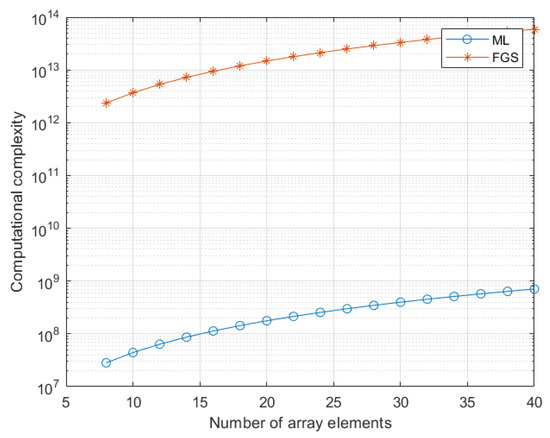 Computational complexities of the multi-dimensional maximum likelihood (ML) and fine grid-search (FGS) methods when the number of array elements varies from 8 to 40.