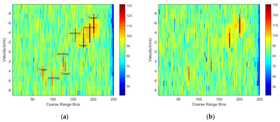 To analyze the performance of suppressing deceptive jamming, the experiment randomly simulates multiple targets and multiple deceptive jamming located in various coarse range bins, velocities and distances. Figure 2 gives the echo plane after matched filtering for the frequency non-agile case and the frequency agile case, where multiple target signals and deceptive jamming signals with random parameters are simulated, where the targets are located in the range bins of 76, 131, 176 and 201, respectively, and the jamming signals are located in the range bins of 99, 126, 156 and 191, respectively. It is observed that the target signals and the deceptive jamming signals are all preserved for the frequency non-agile case in Figure 2a, whereas only the target signals are well preserved for the frequency agile case in Figure 2b.