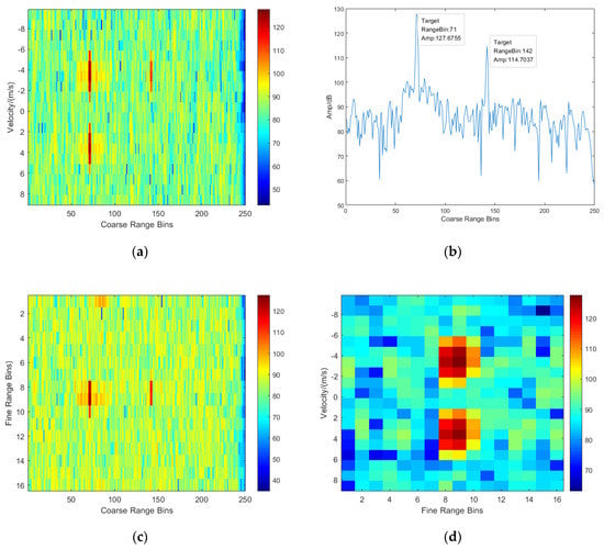 The matched filtering results for the frequency agile case and the frequency non-agile case are given in Figure 3 and Figure 4. Comparing the plane of coarse range bin and velocity given in Figure 3a and Figure 4a, it is clearly observed that the target signal is preserved, and the deceptive jamming is suppressed due to the agile carrier frequency. Figure 3b and Figure 4b are the range cuts of Figure 3a and Figure 4a at the velocity of −3.5 m/s, which show a perfect performance of deceptive jamming suppression for the frequency agile case. Furthermore, a plane of coarse range bin and fine range bin given in Figure 3c indicates that more accurate distance information can be obtained since there is a fine resolving within coarse range bin. In addition, Figure 3d shows the estimation of target speed and accurate distance.