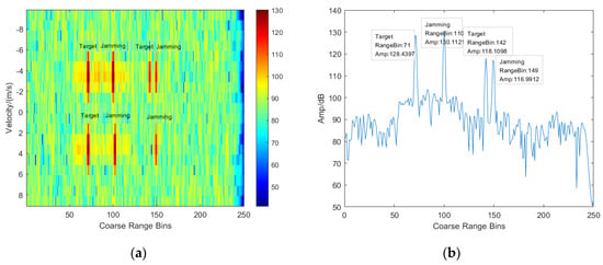 In order to see the performance of suppressing deceptive jamming and range resolution enhancement resulted from frequency agility, three target signals are added in the echo data, where the two targets are set at the 71st coarse range bin and another one is located in the coarse range bin of 114. Meanwhile, four deceptive jamming signals are added, where two deceptive jamming signals are set at the 110th coarse range bin and others are located in the coarse range bin of 149. Additionally, the signals at the same range bin have different speeds and angles.