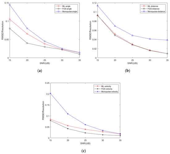 Statistical performance results in SNR cases. (a) Angle estimation results; (b) Range estimation results; (c) Velocity estimation results.