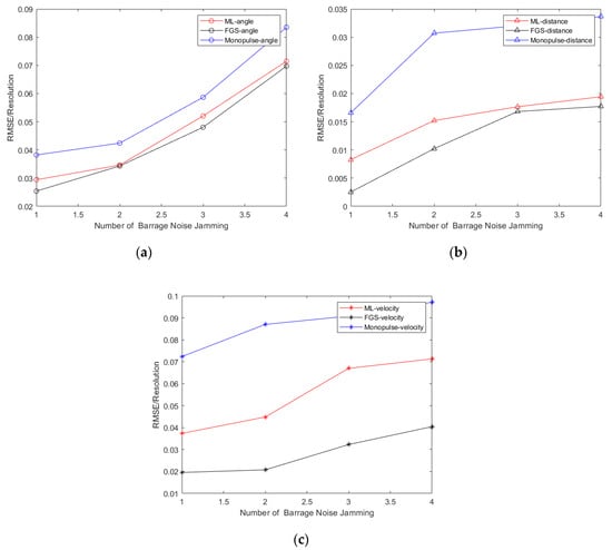 Statistical performance results with the number of barrage noise jamming increasing. (a) Angle estimation results; (b) Range estimation results; (c) Velocity estimation results.