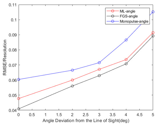 In Figure 8, the NRMSEs as a function of the line of sight are given, where the look direction varies from 90° to 125° and the deviation between the target and the look direction is 0.5°, it is shown that as the look direction deviates from the normal direction, the RMSEs increase, and the parameter estimation performance decreases. Although the performance of the presented method is worse than that of the FGS method, it has a better performance compared to the adaptive monopulse method.