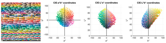 To obtain the simulated test result, the samples were sorted according to the hue angle. Each chip was assigned a number from 1 to 85 in ascending hue order. The L*, C*ab and hab parameters have also been computed.