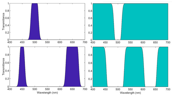 These filters block all wavelengths but those belonging to a specific spectral range (the so called pass-band). We simulated filters with central wavelengths varying from 400 nm to 700 nm, with a 10 nm step. Moreover, for each central wavelength, we simulated filters where the FWHM bandwidth varies from 10 to 100 nm in 10 steps. This was a total of 310 band-pass filters (see example in Figure 3).