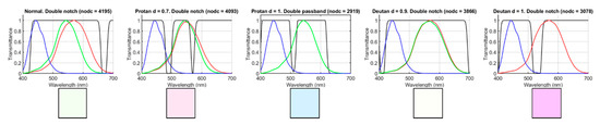 Figure 5 and Table 1 show that, in all cases except for the deuteranopic simulated observer, the filter that maximized NODC was a double notch filter. In any case, the double band-pass filter obtained for the deuteranopic simulated observer was very similar to a double notch. It is relevant to comment on the fact that for dichromats, the selected filters had a high transmittance in most of the wavelength range covered by the cone responsivity curves, and they included a narrow band of lower transmittance in between the two curves. For the normal and deuteranomalous subjects, the selected filters only had a low transmittance in the extreme portions of the visible range (especially in the blue region). For the protanomalous observer, the selected filter had two narrow bands of low transmittance, one in the area between the S and M and the other in the area between the L and M curves.