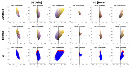 L*, a*, b* data clouds for the protanomalous simulated observer. Left: D1 dataset. Right: D2 dataset. First row: unfiltered; second row: filtered; third row: both filtered and unfiltered distributions in the same graph (red = unfiltered, blue = filtered).