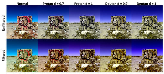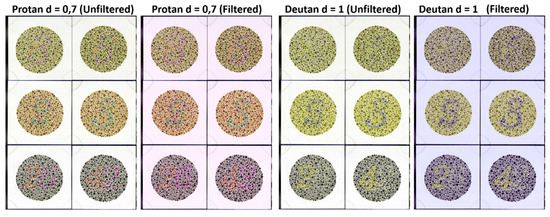 In Figure 8, the six Ishihara plates belonging to dataset D3 are shown as sRGB renderings, for the protanomalous and deuteranope observers, with and without a filter. It can be observed that the effect of the filters on the appearance of the plates was not very relevant. These filters did not allow the simulated observers to pass the Ishihara test. As is shown in [10], the VINO commercial filter produced the opposite effect and allowed the simulated observers to recognize the numbers or tracks in the Ishihara plates, because this filter shifts all colors to the fourth quadrant and causes an increase in the contrast between the number and the background for CVD subjects, at the cost of substantially changing their color appearance. However, as shown in Table 3, this filter caused a decrease in the NODC for all simulated observers.