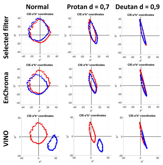 In Figure 10, the a*-b* distributions for the three trichromat simulated subjects are shown (normal observer on the left, protanomalous in the middle, and deuteranomalous on the right), without (red) and with the selected filter for each observer (blue). The distributions for the two commercial filters EnChroma and VINO are also shown for all observers.