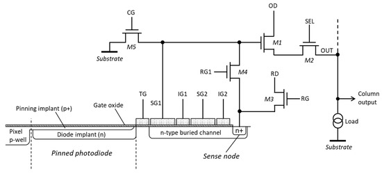 The most widely used pixel architecture in modern CISs is based on the pinned photodiode (PPD) [16]. The PPD achieves very low dark currents due to its pinning implant, low image lag and high conversion gain, which it achieves by using a small sense node separate from the charge collection region. The PPD relies on the efficient transfer of charge to the sense node, where the conversion to voltage occurs after the charge has been collected. Due to its excellent electro-optical characteristics and charge transfer capabilities, the PPD is one candidate for constructing a pixel capable of multiple-signal sampling.