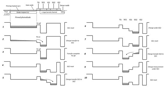 Once the charge has been transferred, as shown in step 6, SG1 is reset by turning on M3 and M4, with M5 turned off (step 7). After this, the transistors M3 and M4 are turned off and the reset level on SG1 is read out via the source follower M1 as required to implement correlated double sampling (CDS). Next, the potential on SG2 is lowered so that the charge can be transferred back under SG1 (step 8). After the transfer is complete, the amount of charge under SG1 is measured by differencing the voltage level on SG1 and the previously taken reset sample. By repeating steps 4 to 10, it is possible to measure the signal charge under SG1 multiple times non-destructively.