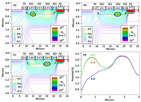 Simulated potential profile in the buried channel and electron density plots for the charge stored under SG1 (a), during transfer from SG1 to SG2 (b) and for the charge stored under SG2 (c). Plot (d) shows the potential along the dashed lines in (a–c).