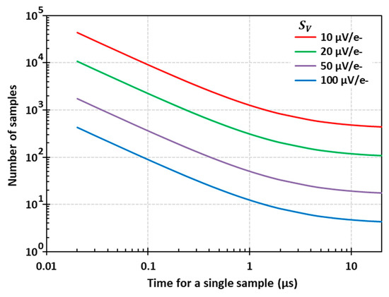After optimization of the source follower’s channel length and width, its noise performance is determined mainly by the foundry process, leaving the conversion gain as the most important parameter in Equation (6) to address. Using typical transistor noise parameters for 180 nm CMOS image sensor process, we can calculate the number of samples and the row readout time as a function of . As a representative example, Figure 4 shows the number of samples required to achieve single-photon sensitivity ( 0.15 e- RMS), calculated from Equation (5) for and . These parameters are typical and were not taken for a specific foundry; however, we expect to see gradual improvements in the future from advances in the processing technology for low-noise transistors.