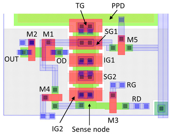 In this layout, the total capacitance of SG1 has been estimated by capacitance extraction from the Cadence Virtuoso CAD software, giving 2.63 fF and = 61 µV/e-. This conversion gain is lower than the one derived from the TCAD simulation in Section 3.2 due to the inclusion of the source follower and all other parasitic capacitances, but is still high enough to allow sensors with single-photon sensitivity to be built. Using a 1-MHz readout frequency, Equation (3) gives ENC = 0.88 e- RMS for a single measurement and a line rate of nearly 30,000 rows/s with averaging of 34 samples to finally achieve ENC = 0.15 e- RMS. This would translate to 30 fps from a 1-Mpixel sensor. In comparison, an EMCCD with the same format (e.g., CCD201-20 from Teledyne e2v) achieves 14 fps with sub-electron noise at a 15-MHz serial pixel rate.