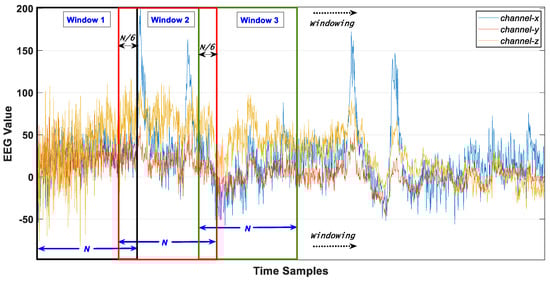 Data are split into fixed length () windows with an overlapping size of as shown in Figure 1 (displayed for three random channels). One window of EEG data is given in Figure 2 where M is the number of selected channels, Cab is “bth data point of channel a”.