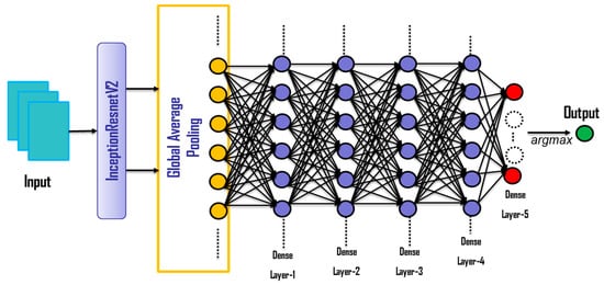 In this work a pretrained CNN network, InceptionResnetV2, is used as base model. Following InceptionResnetV2, Global Average Pooling layer is added for decreasing the data dimension and extra dense layers (fully connected layers) are added in order to increase the depth and success for classifying complex data. The overall network structure is given in Figure 3, and the properties of the layers following the CNN is described in Table 1. The training parameters are specified in Table 2. In Figure 3, Dense Layer-5 determines the number of output classes and argMax selects the one with the maximum probability. We use the “relu” activation function to cover the interaction effects and non-linearities. This is very important in our problem, while using a deep learning model. Relu is one of the most widely used and successful activation functions in the field of artificial neural networks. Moreover, at the last dense layer, we use the “softmax” activation in order to produce the class probabilities.