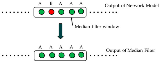 Emotions change quicker than moods for healthy people [77]. However, in very short time intervals (in the range of few seconds), the emotions show lesser variance in healthy individuals with good emotion regulation. Different from the studies [75,76], the filtering is applied on the output in our method. It is assumed that in a defined small-time interval T the emotion state does not change. Therefore, we apply a median filter on the output data inside a specific time interval with an aim of removing the false alarms and increase the overall emotion classification accuracy. This process is shown in Figure 4 where A and B stands for different classes.